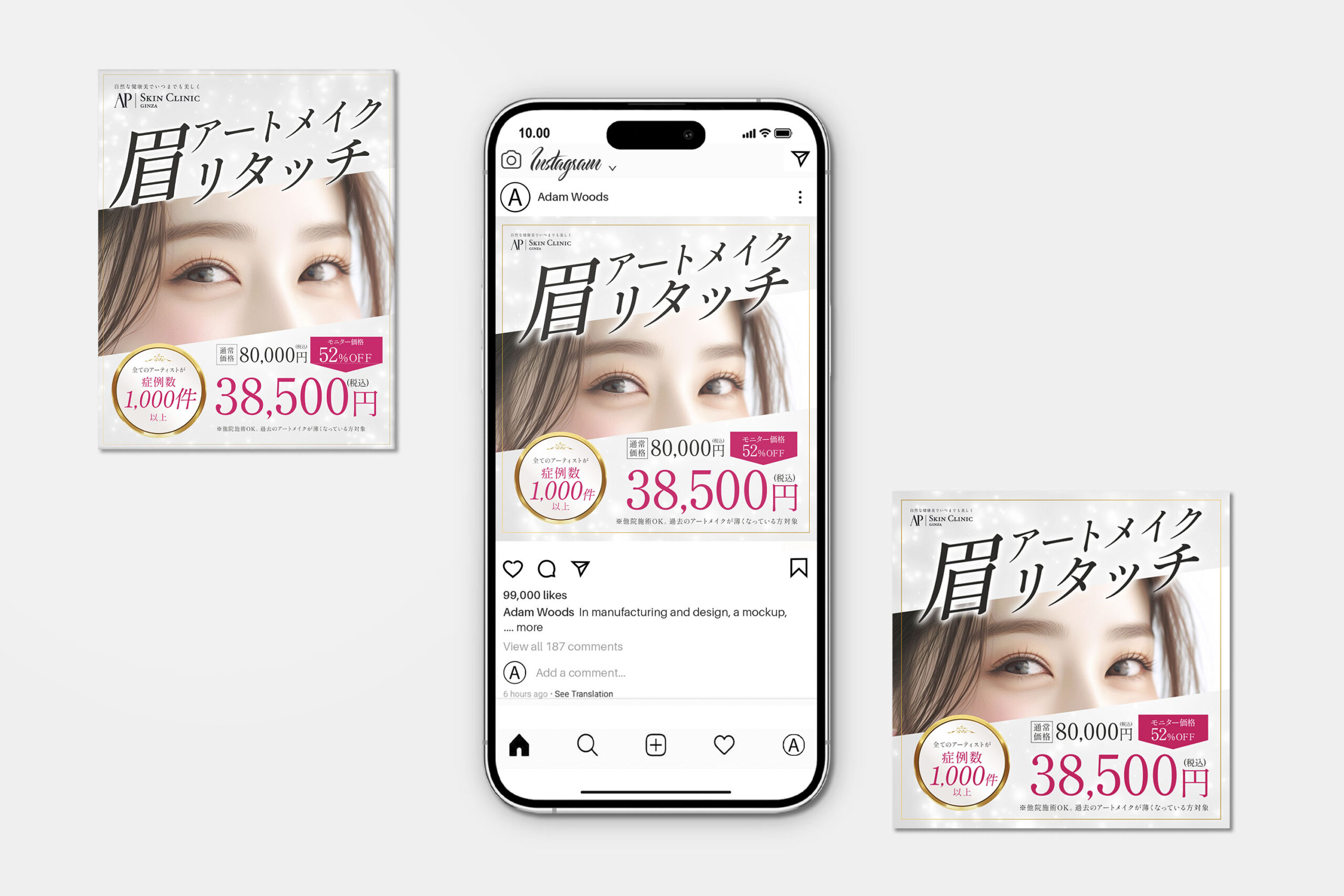 美容クリニック「AP SKIN CLINIC」で行なっているアートメイクのリタッチ用広告バナーを制作いたしました。他社に比べて手頃な価格設定という点を強調し、豊富な症例を持つアーティストの技術を際立たせました。また、目を引く美しい眉を連想させる写真選びにもこだわり、視覚的に訴えるデザインにしています。お客様が思わずクリックしたくなるような魅力的なビジュアルで、信頼感を与える広告を提案いたします。